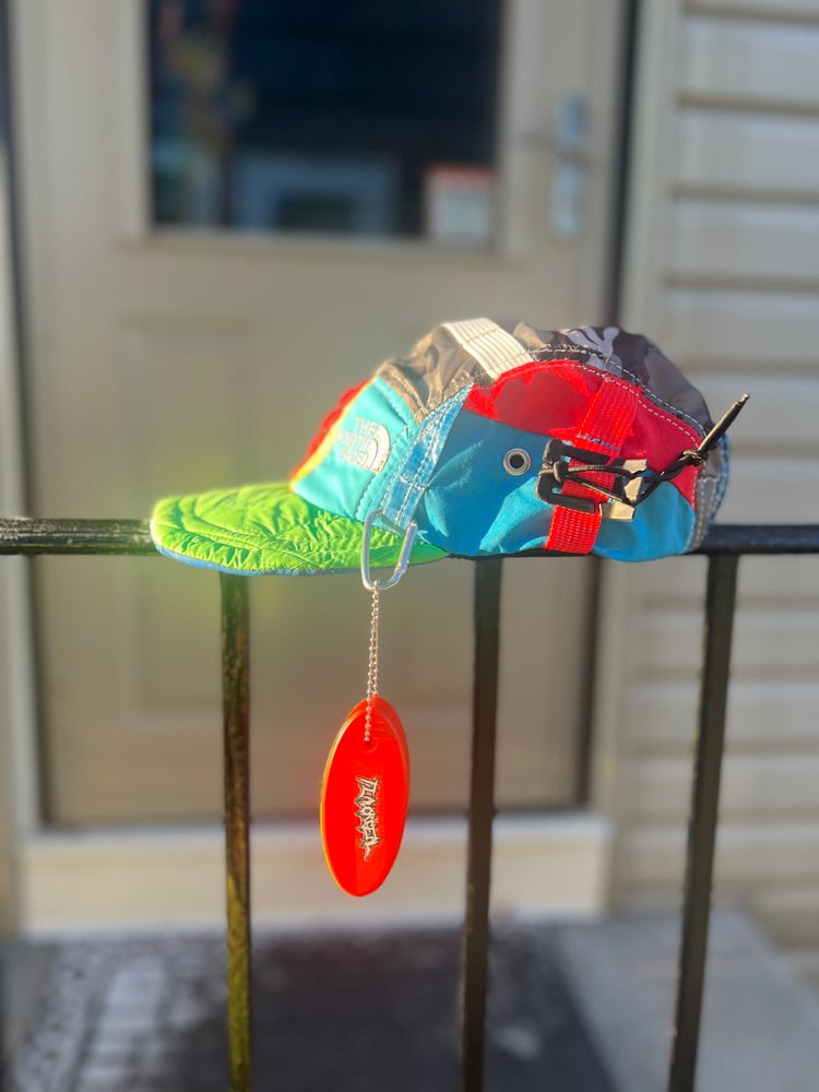 Made from Vintage Extreme TNF Goretex Jacket. Nylon Black Camo Upper. Dyneema Glow Strip, Custom Reflective Fabrics, Quilted Brim, White and Red Webbing with Clip and Custom Float Fob. 1 of 1 Fully adjustable