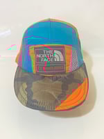 Made from a Damaged Orange Goretex North Face Summit Series Jacket and a Blue/Teal Hyvent with added reflective, glow, and metallic nylon fabrics. Upper Panel Zippered Stash Pocket. Side Panel Hook and Loop Reflector. Teal Utility Loop Webbing on Front Panel